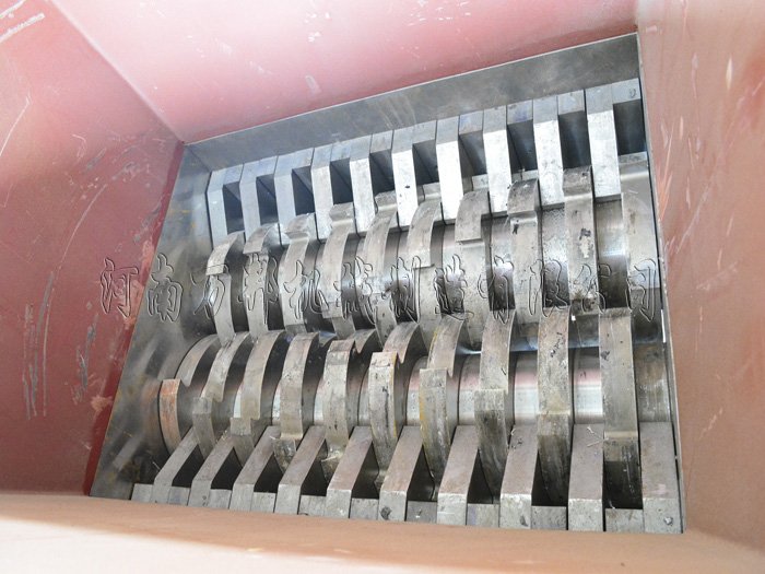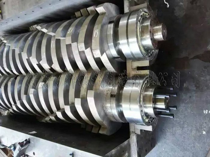 轮胎撕碎机采用两套装有撕碎机刀片的转子在设备机腔内相对旋转从而采用收缩两轴夹角的原理对进入机腔内的物料进行挤压,由于刀片的特殊设计进入两轴夹角后的物料被刀片棱角固定从而进一步为夹角的收缩创造条件,在物料受力达到物料屈服强度后物料在刀片间开始断裂,从而完成撕碎效果。